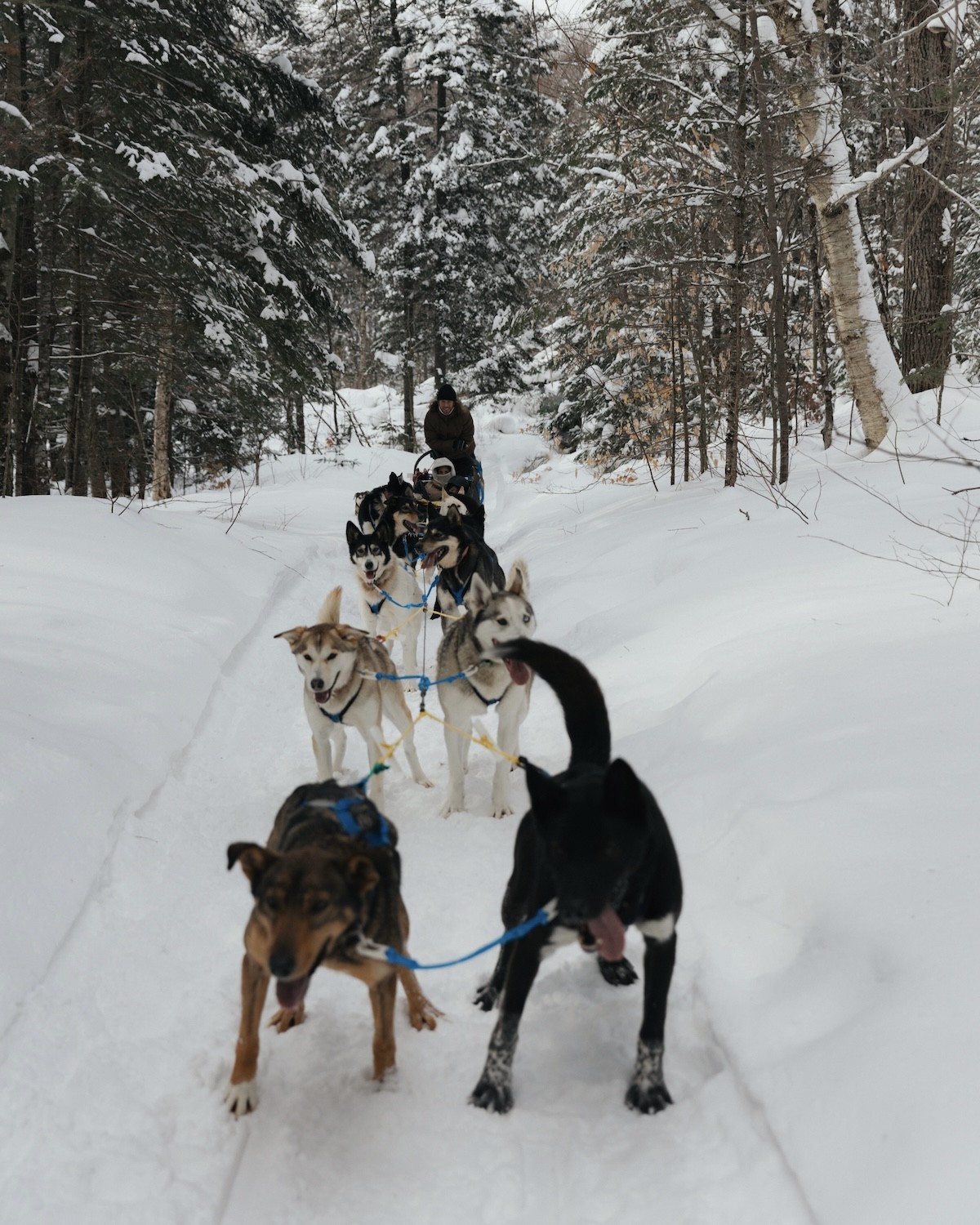 À 90 minutes de Montréal, le centre d’activités Kanatha-Aki propose des balades en chien de traîneau à travers les sentiers forestiers des montagnes laurentiennes. C’est une activité que je voulais faire depuis si longtemps ! On a choisi une balade d’une heure avec Felix, notre musher du jour. Ses 10 adorables chiens, qu’il considère comme ses enfants, nous ont emmené en plein milieu de la forêt enneigée. Pour ne pas avoir froid, on était emmitouflé dans un gros plaid avec Oscar dans le traineau pendant que Julien dirigeait les chiens à l’arrière avec Felix. C’était un moment incroyable.